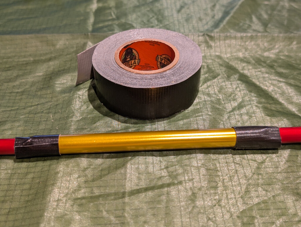 Ensuite, il suffit de coller aux extrémités du scotch puissant (type Duct-Tape) afin que le manchon reste en place. Cette réparation vous permet de poursuivre temporairement votre bivouac. Par la suite, dès que vous le pourrez, il faudra changer le brin d’arceau cassé et le remplacer par un neuf (méthode 1).