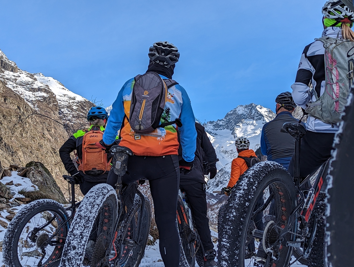 Ah oui, parce que la particularité, c’est de nous déplacer à bicyclette aux pneus surdimensionnés ; ce qui signifie qu’on se balade en 26×4.8 pour s’offrir la meilleure adhérence au sol. Elles étaient donc toutes énormes…. ces roues de Fatbike ! Et pour cause, il fallait au moins ça pour rouler sur la neige, dans la boue, le gravier et sur les rives de la Séveraisse.